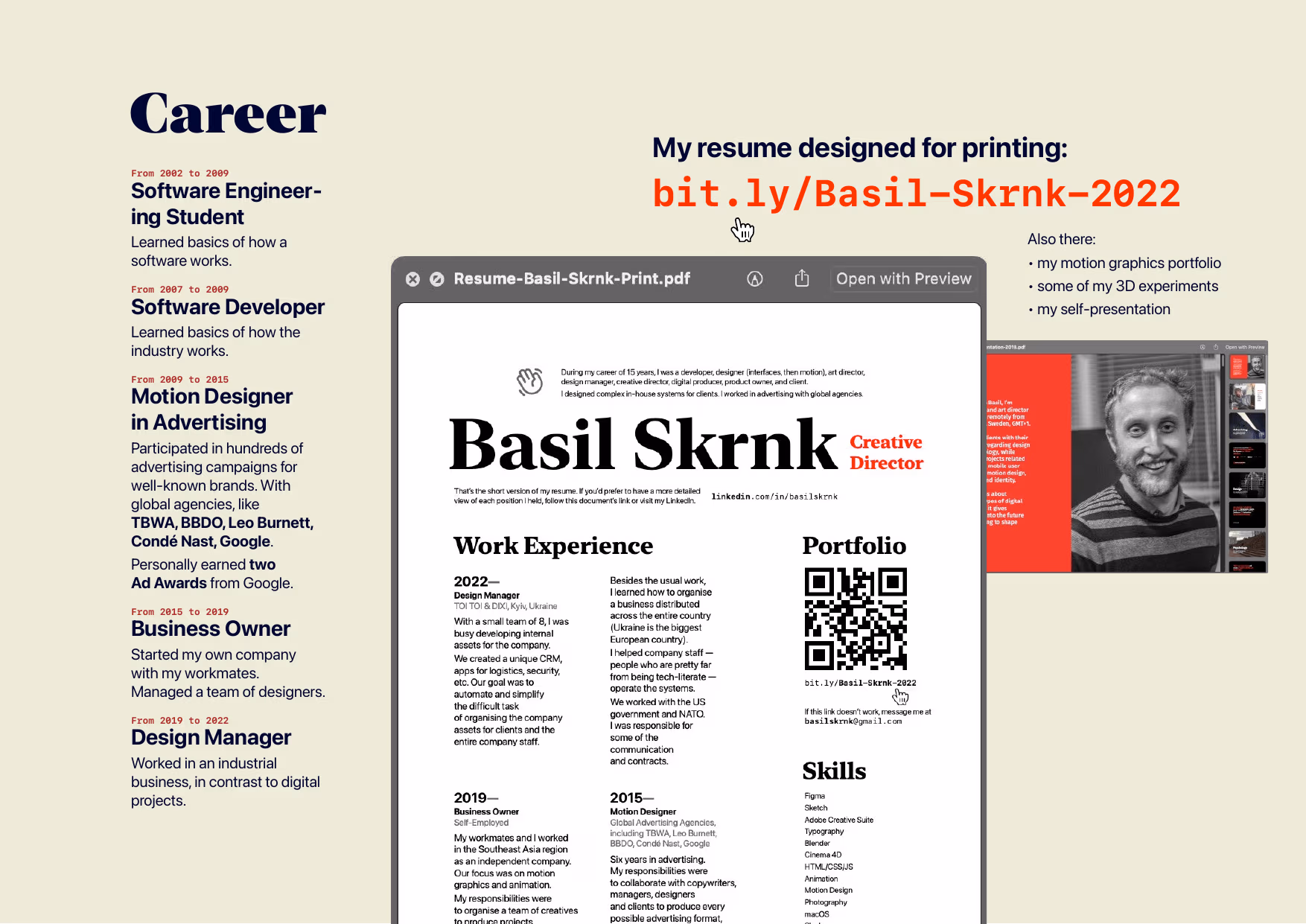 Here, I briefly introduce myself, in case this document is viewed first. I mention there’s my resume, and my self-presentation too.