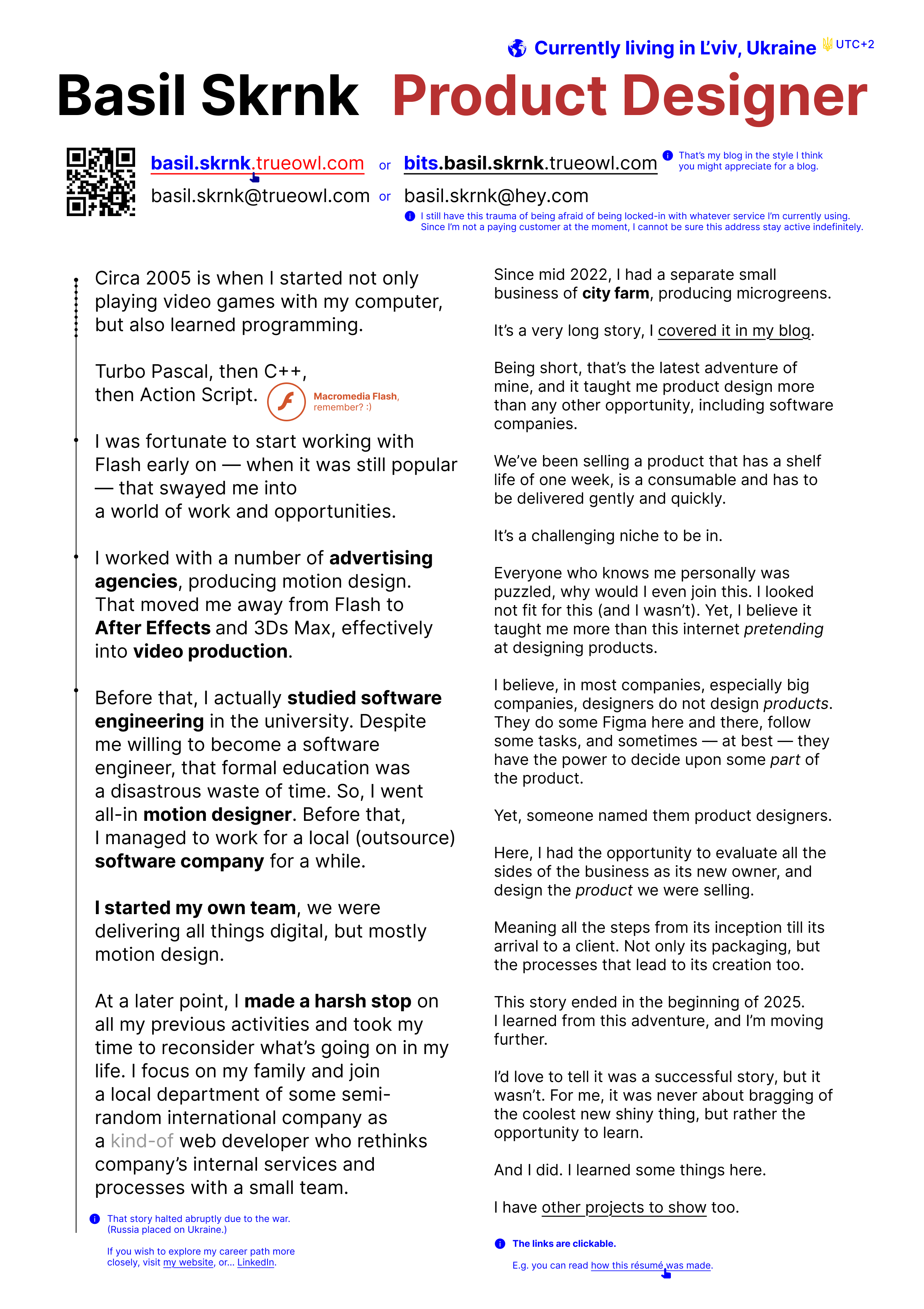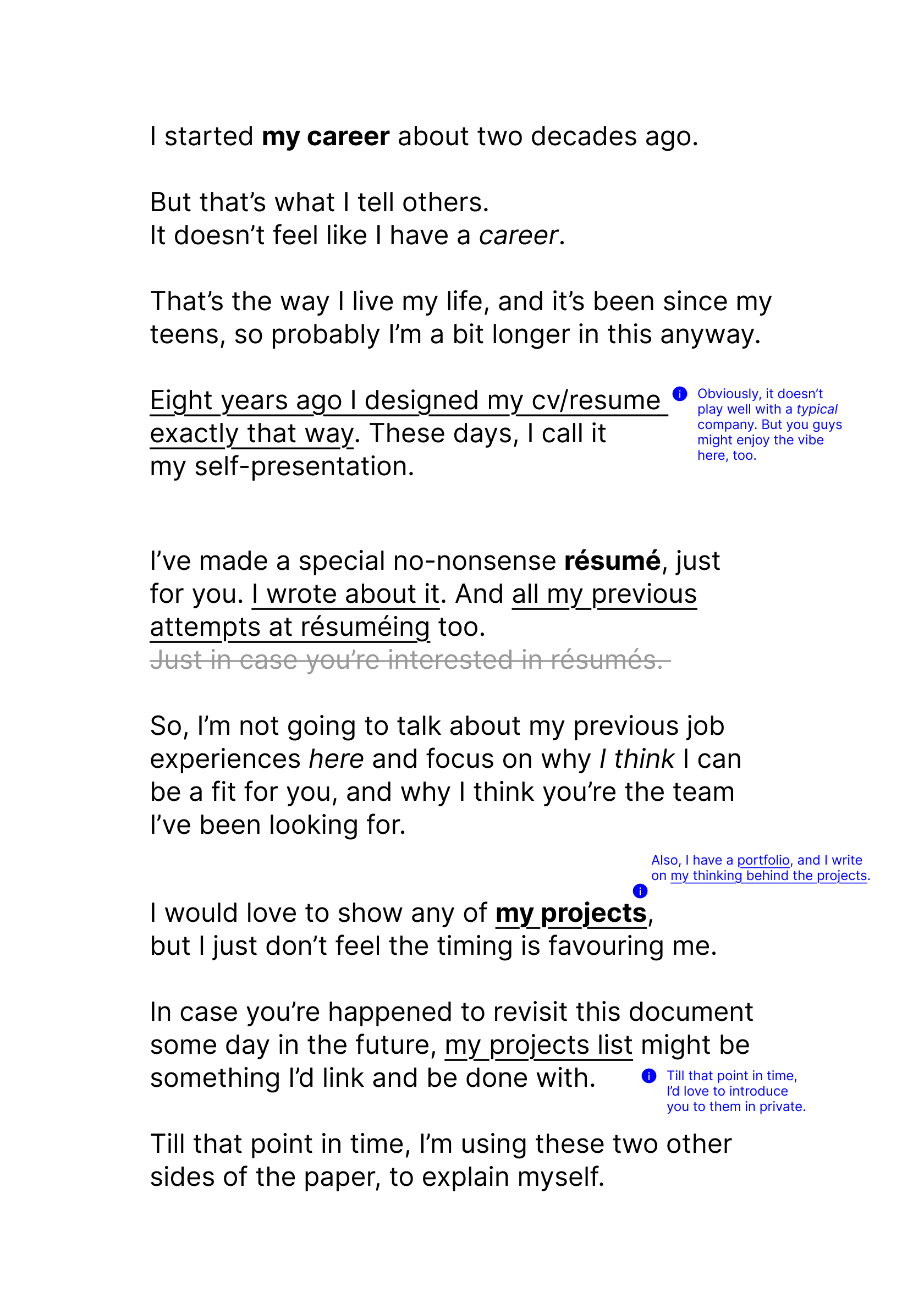 With resume I decided to go with just one A4 page. I tried to de-bullshit it.